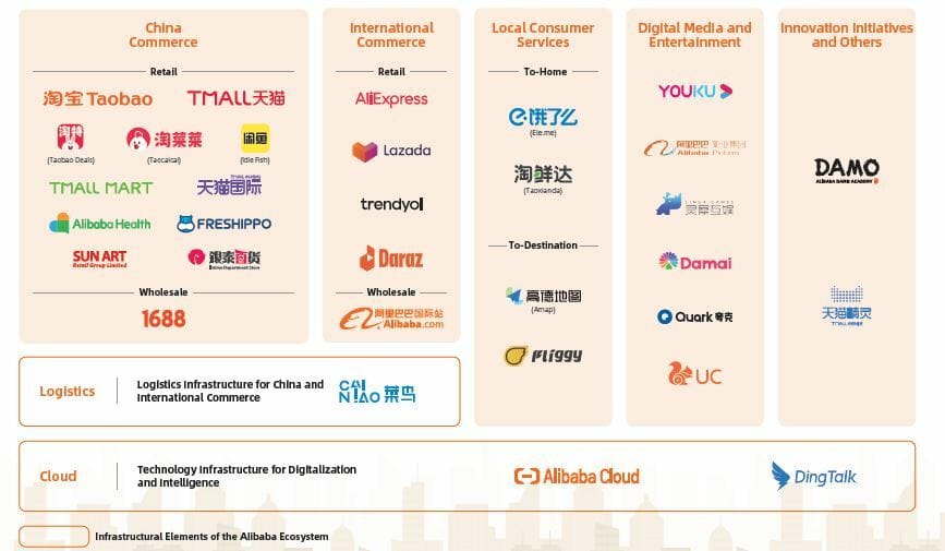 Seus tentáculos estão em Comércio Chinês, Comércio Internacional, Serviços Locais, Logística, Nuvem, Mídia e por fim serviços financeiros
