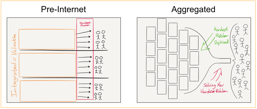 No entanto, mais crucial do que a oferta ilimitada é a capacidade de agregar a demanda dos consumidores. Empresas que conseguem centralizar essa demanda atuam como intermediárias essenciais entre consumidores e fornecedores, cobrando um "pedágio" sobre transações econômicas.
