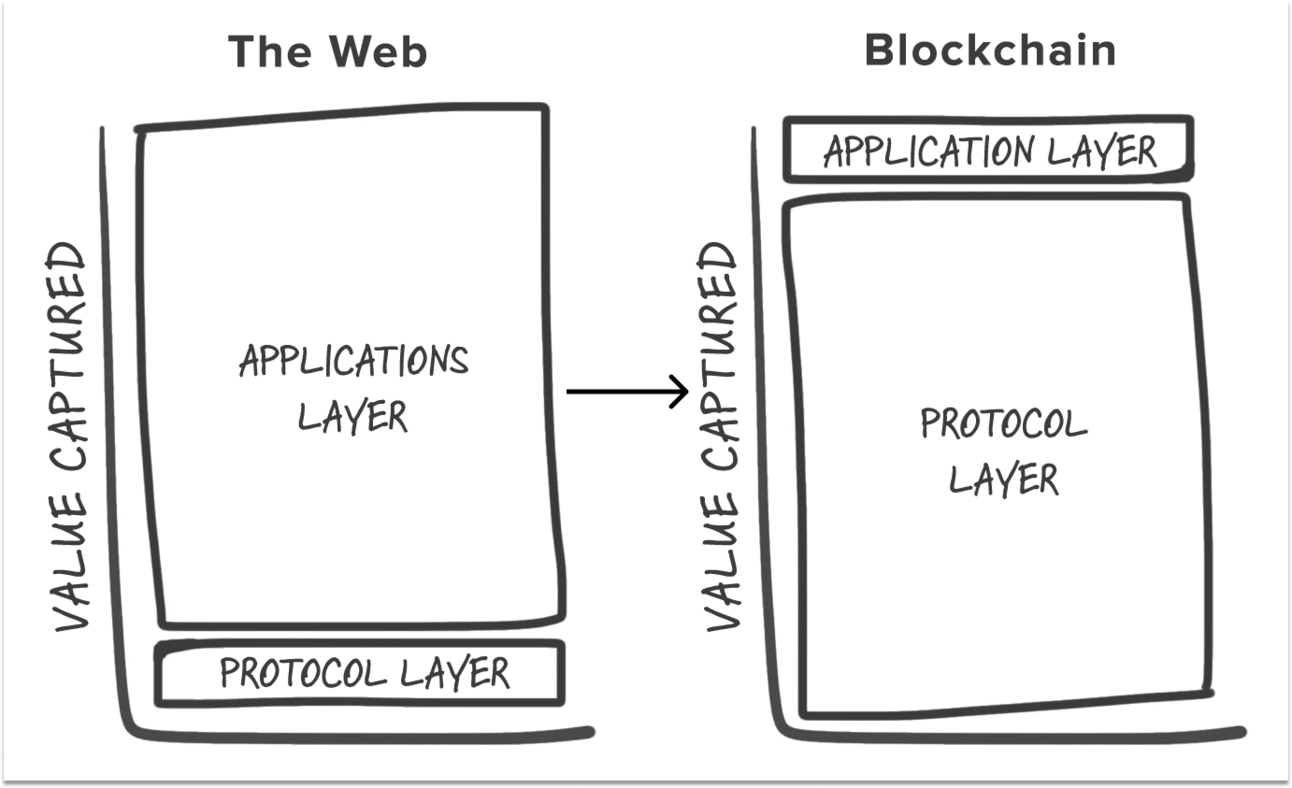Na Internet, as maiores empresas são de aplicações. O Google, Amazon, Netflix e Facebook são alguns exemplos. Não existe uma empresa trilionária chamada “Internet Ltda” que é dona da infraestrutura da Internet. Existe uma teoria, especialmente entre investidores de blockchains, que nas próximas plataformas computacionais, as empresas criadoras da infraestrutura e protocolos nos quais os aplicativos rodam (sabendo do que aconteceu na Internet), vão encontrar formas de capturar a maior parte do valor. É a tese do “Protocolo Gordo” do Joel Monegro, ex-USV e atualmente sócio da Placeholder Ventures.