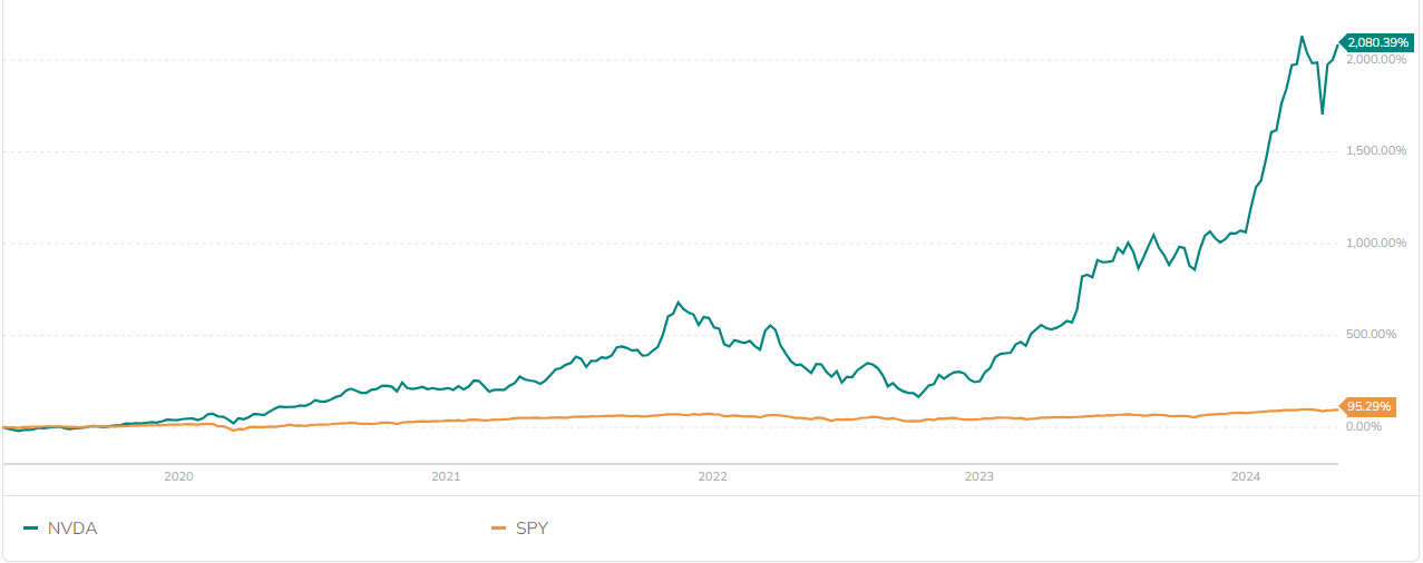 A valorização recente da Nvidia é impressionante. Fundada em 1993, a empresa está avaliada hoje em US$2,3 trilhões. Somente este ano, suas ações subiram 84% e triplicaram nos últimos 12 meses. O gráfico que compara o desempenho das ações da Nvidia com o índice de ações americano S&P 500 nos últimos cinco anos é chocante.